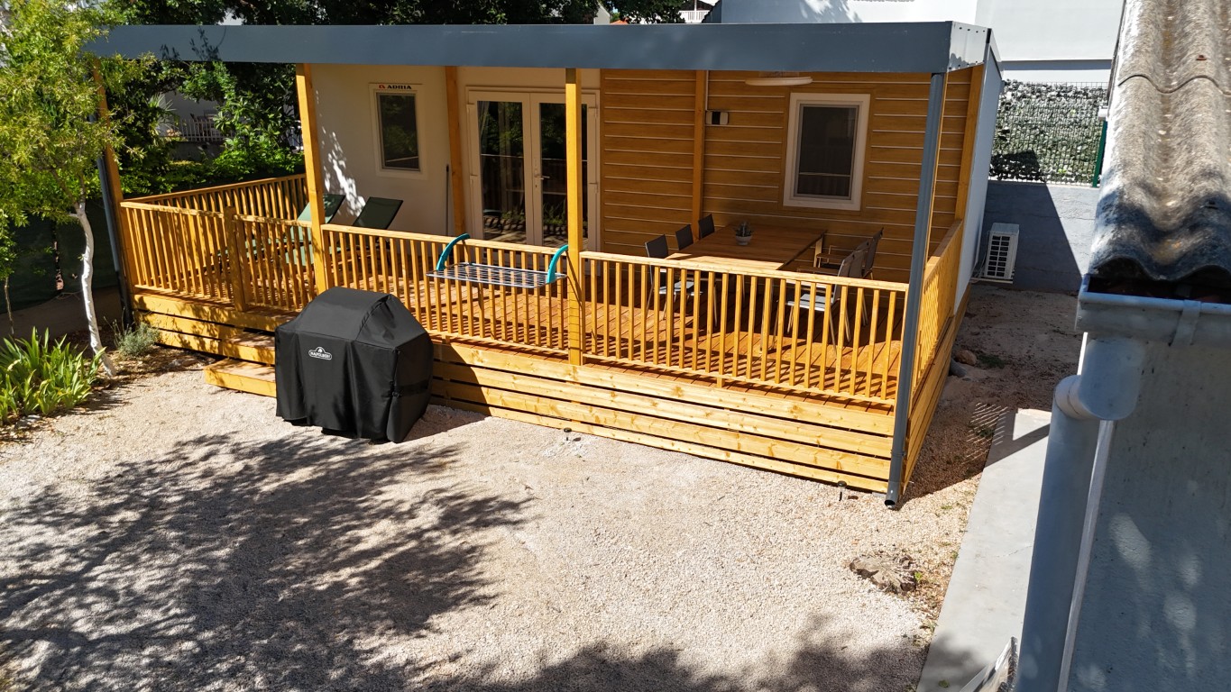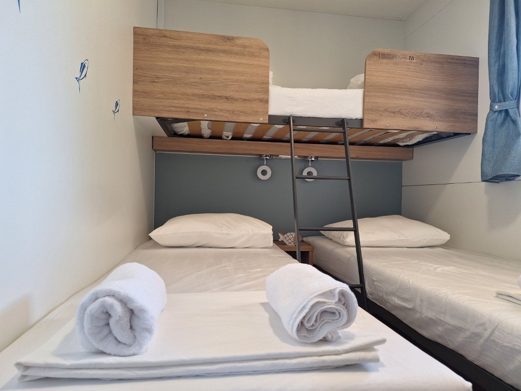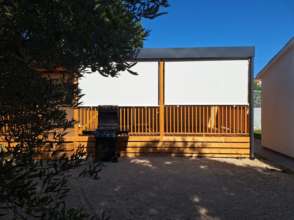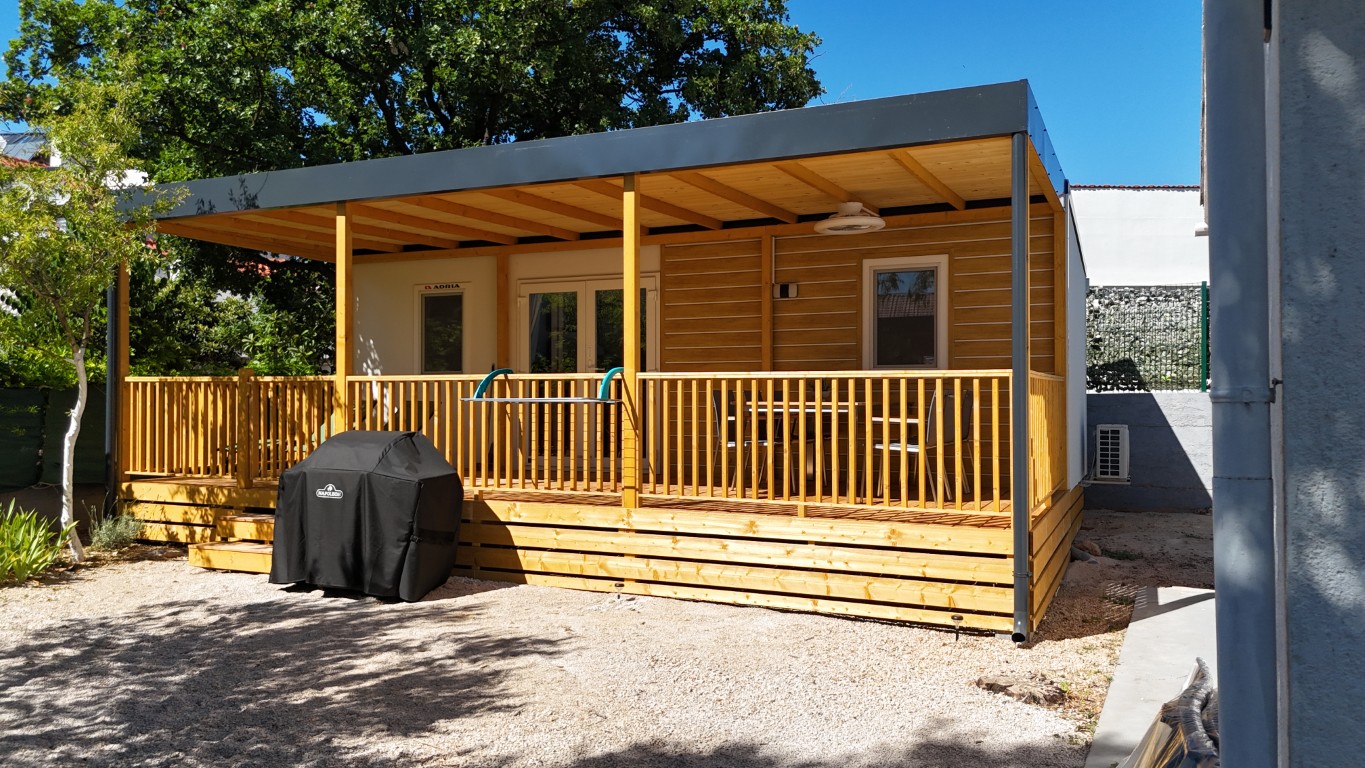 A fully equipped ADRIA mobile home with a spacious covered terrace – the perfect choice for a relaxed family holiday by the sea. Located in a quiet setting, just one minute’s walk from the beach, and only steps from the seaside promenade that connects Srima with Vodice. The home comfortably accommodates up to five guests. It features two bedrooms – one with a double bed (140 × 200 cm), and the other with two single beds (70 × 190 cm) and a bunk bed (70 × 160 cm; suitable for a up to 80 kg). There is no sofa bed in the living room, which allows for more open space and comfort in the shared area. The kitchen is fully equipped with everything you need for preparing meals: plates, mugs, glasses, cutlery, cookware, an electric toaster, air fryer, hand blender, and a NESCAFÉ coffee machine. It also includes a dishwasher and a fridge with freezer, making it ideal for longer stays. The bathroom includes a shower cabin, bidet, sink, and toilet. The home also features high-speed Wi-Fi. For your convenience, guests are provided with towels, bed linen, kitchen cloths, as well as shower gel and hand soap. Outside, the large terrace includes a dining table with six chairs, two sun loungers, an outdoor shower, and a top-quality NAPOLEON gas grill – perfect for enjoying warm summer evenings with your family. Zala offers functionality, comfort, and a peaceful location – the ideal base for families seeking a cozy seaside experience.